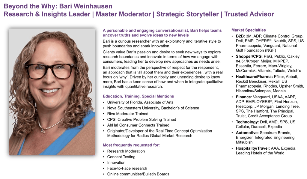 "I am thrilled to recommend Bari, not only because of her impressive professional skills but also because of what a wonderful person she is to work with. Bari is an outstanding qualitative research expert, with extensive experience in moderating a wide range of methodologies, including online bulletin boards, depth interviews, shop-alongs, and traditional focus groups. Her strategic thinking abilities shine through in every project she takes on, as she has an innate talent for simplifying complex issues and turning them into clear, actionable insights. Bari has an incredible ability to engage respondents in heartfelt, meaningful conversations that go beyond surface-level answers, providing rich, valuable data that drives true strategic decisions. She approaches every research initiative with a thoughtful, tailored approach and ensures the process is as seamless as it is insightful. On top of all this, Bari is simply a joy to work with. Her collaborative nature, professionalism, and positive attitude make her an asset to any team." Beth Surowiec