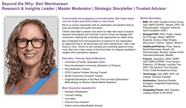 "Bari is an esteemed research moderator who skillfully guides her clients through complicated, strategic topics to uncover insight from any audience you can give her. Cool under pressure and creative with solutions, Bari is relied upon as a mentor to me and many others. If you want sound leadership that can create new solutions and shape executive thinking, get Bari on your team." Christine Hall
